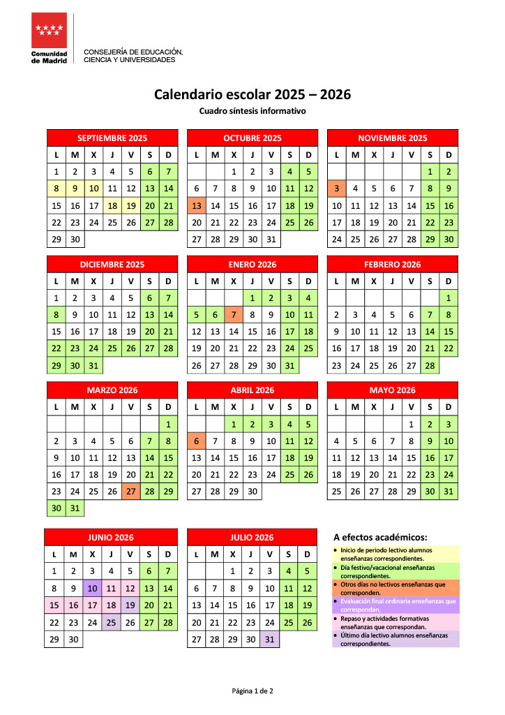 ¡¡¡Ya tenemos todo preparado para arrancar este nuevo curso!!! Os dejamos el calendario escolar aprobado por la Comunidad de Madrid para el curso 2025/2026.